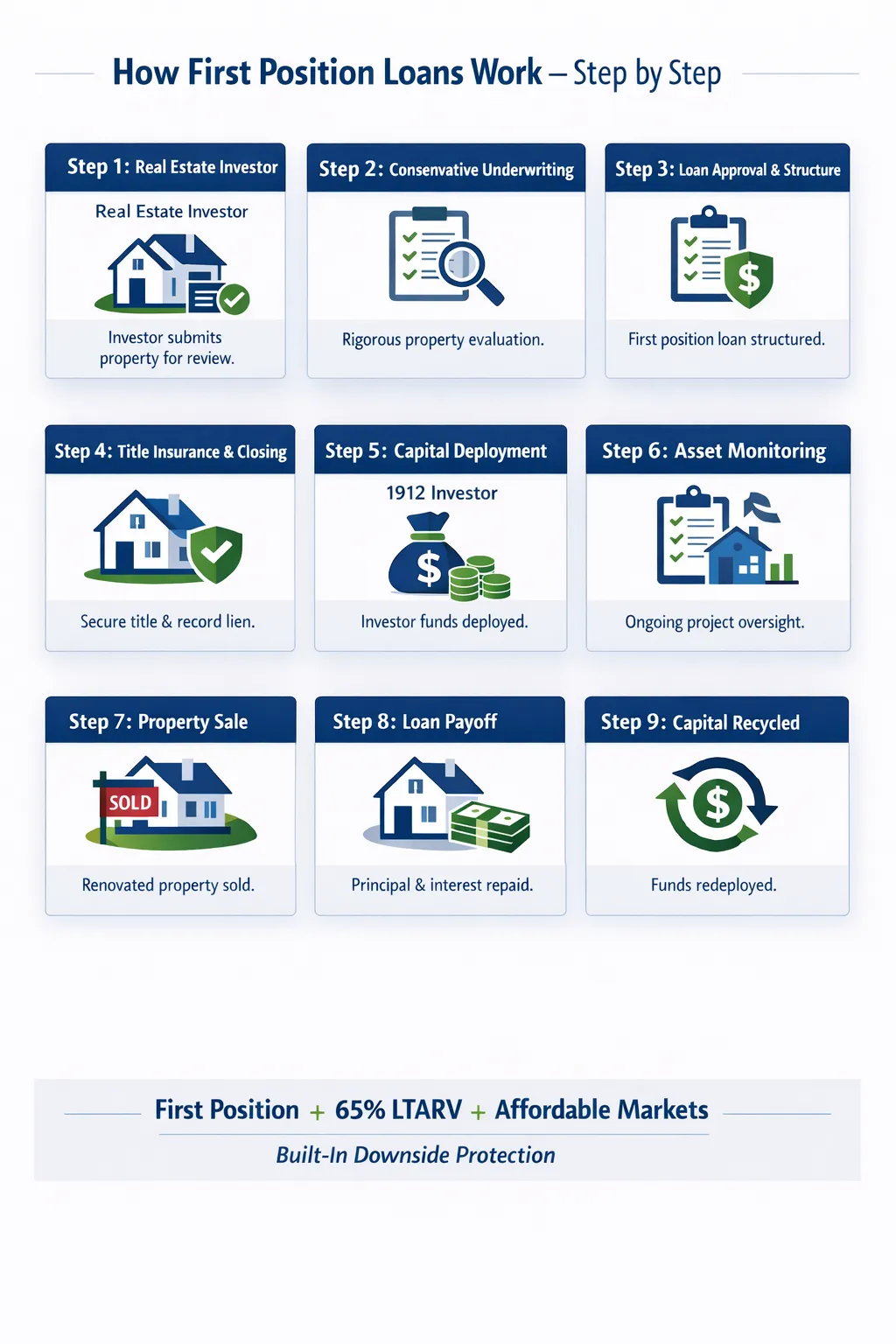 1912 Capital provides investors access to consistent, risk-managed returns by financing single-family fix-and-flip homes in stable Midwest and Mid-South markets. We focus on fundamentals, conservative underwriting, and real housing demand—not speculation or market hype.